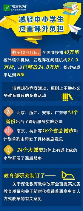 為推進(jìn)綜合治理,教育部正會(huì)同有關(guān)部門研究制定中小學(xué)生綜合減負(fù)措施,明確各方責(zé)任,形成政府、學(xué)校、校外培訓(xùn)機(jī)構(gòu)、家庭協(xié)同推進(jìn)減負(fù)工作合力。呂玉剛表示,下一步,要進(jìn)一步加大校外培訓(xùn)機(jī)構(gòu)治理力度,切實(shí)解決校外培訓(xùn)機(jī)構(gòu)存在安全隱患、無證無照、超標(biāo)超前教學(xué)等突出問題,確保年底前完成集中整改工作。在此基礎(chǔ)上,強(qiáng)化督導(dǎo)檢查,鞏固治理成果,堅(jiān)決防止反彈,建立健全校外培訓(xùn)機(jī)構(gòu)規(guī)范有序發(fā)展的長(zhǎng)效機(jī)制,使校外培訓(xùn)走上制度化、規(guī)范化管理軌道,真正成為學(xué)校教育的有益補(bǔ)充,促進(jìn)中小學(xué)生全面健康發(fā)展。