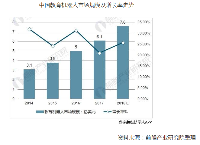 據(jù)前瞻產(chǎn)業(yè)研究院發(fā)布的《中國教育機(jī)器人行業(yè)發(fā)展前景預(yù)測與投資規(guī)劃分析報告》數(shù)據(jù)顯示,2017年中國教育機(jī)器人市場規(guī)模為6.1億元,同比增長21.1%,隨著國家政策大力扶持人工智能中小學(xué)落地,預(yù)計中國教育機(jī)器人市場將持續(xù)穩(wěn)定增長,預(yù)計2018年中國教育機(jī)器人市場規(guī)模將達(dá)到7.6億元,增長率為25.8%。
