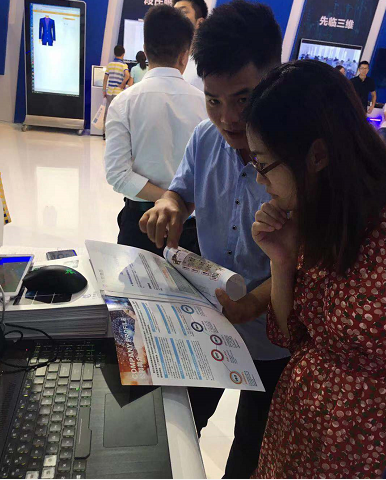 觀眾在智博會(huì)現(xiàn)場(chǎng)體驗(yàn)服裝行業(yè)的“一分鐘換裝技術(shù)”