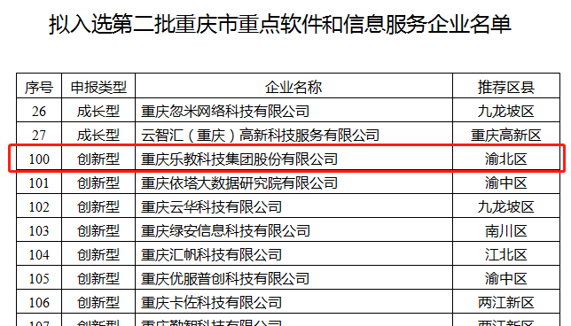 喜報(bào)l重慶樂(lè)教科技集團(tuán)入選“第二批重慶市重點(diǎn)軟件和信息服務(wù)企業(yè)名單”